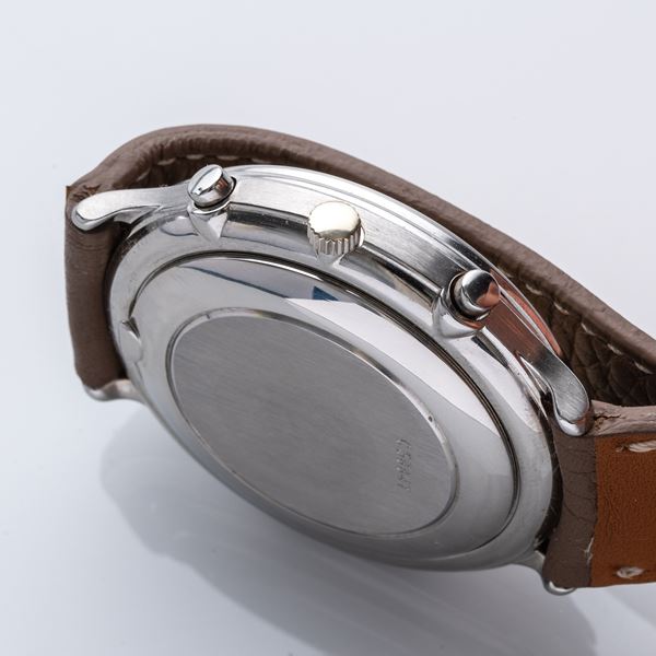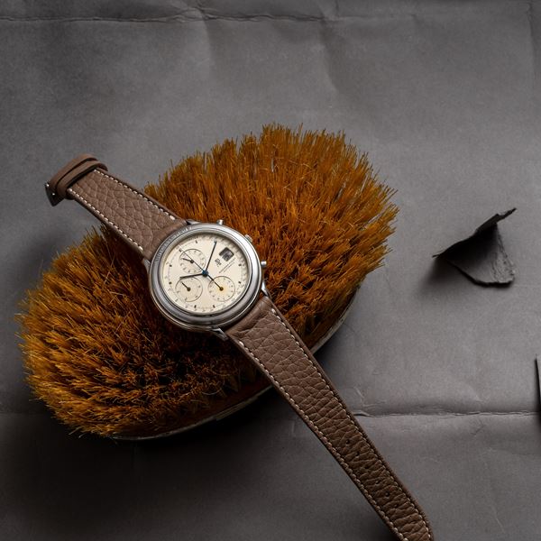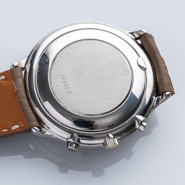 Note: Cronografo automatico con quadrante in panna e tre contatori, datario ad ore tre, numeri arabi. Sfere a bastone blu. Vetro minerale piatto. Fondello a pressione.