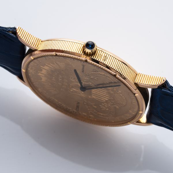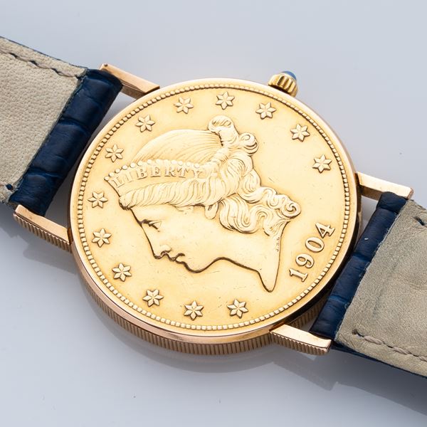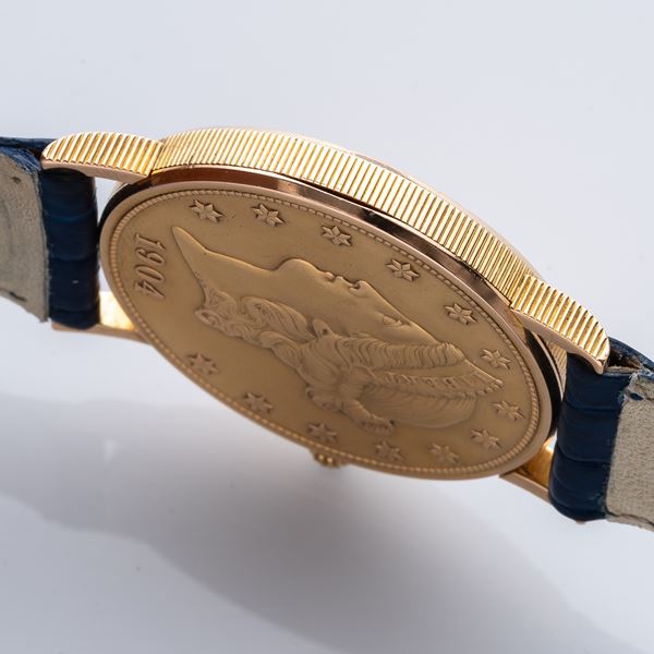 OROLOGIO IN ORO GIALLO 18KT A CARICA AUTOMATICA CON MONETA DA 20 DOLLARI IN ORO.