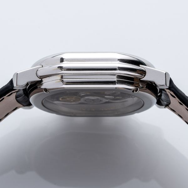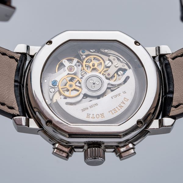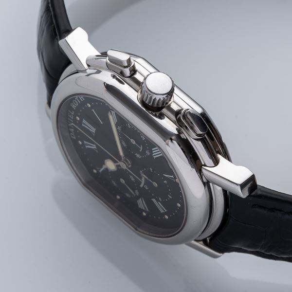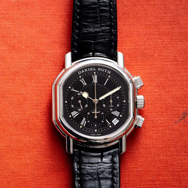Note: Quadrante nero tapisserie bitonale con ghiera interna lucida. Indici romani applicati, sfere dei minuti e delle ore luminescenti. Datario ad ore quattro, piccoli secondi ad ore nove. Fondello con movimento a vista. Cinturino in pelle Daniel Roth, deployante in acciaio Daniel Roth.