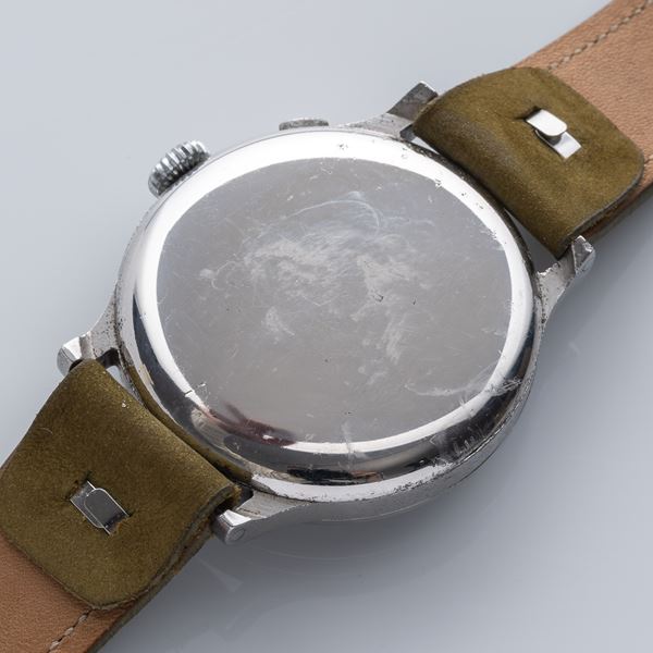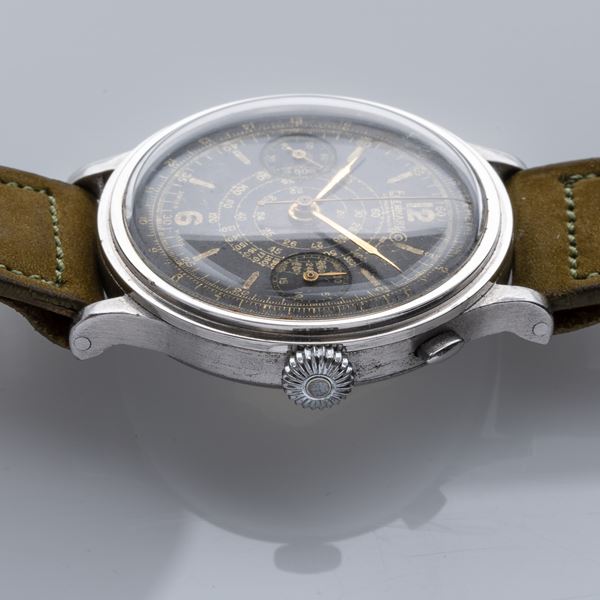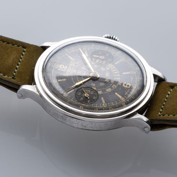 Note: Quadrante nero gilt, indici a barretta stampati dorati e numero arabo a ore dodici e ad ore sei. Scala telemetrica periferica e tachimetrica a chiocciola al centro. Sfere delle ore e dei minuti, contatori di tipo moderno dorate. Vetro plexi bombato, ghiera a due gradini, pulsante ad oliva e corona a cipolla. Fondello a pressione, anse fisse.