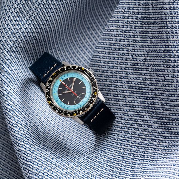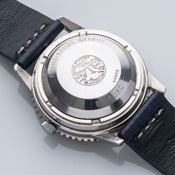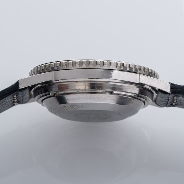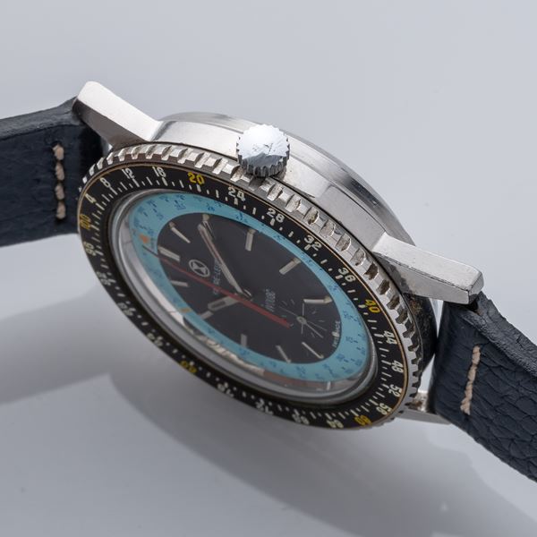 Note: Quadrante bitonale nero e blu, con scala esterna barometrica e altimetrica. Sfere e indici a bastone con materiale luminescente, sfera barometrica rossa. Vetro plexi bombato, fondello a vite. Fibbia in acciaio Favre Leuba.