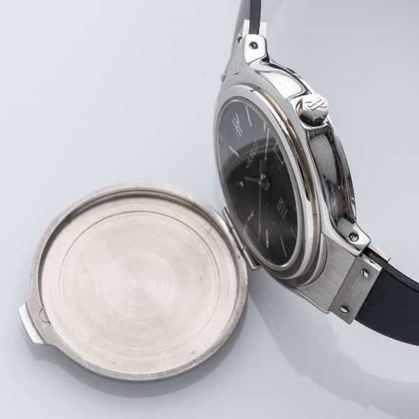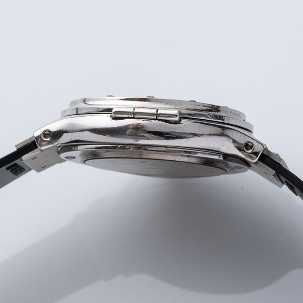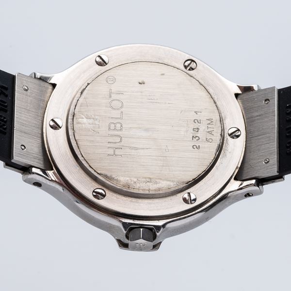 Note: Orologio in acciaio con cupola laterale. Quadrante nero, indici e sfere a bastone color argento. Datario ad ore tre. Vetro minerale piatto. Cinturino in gomma, deployante Hublot.