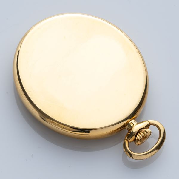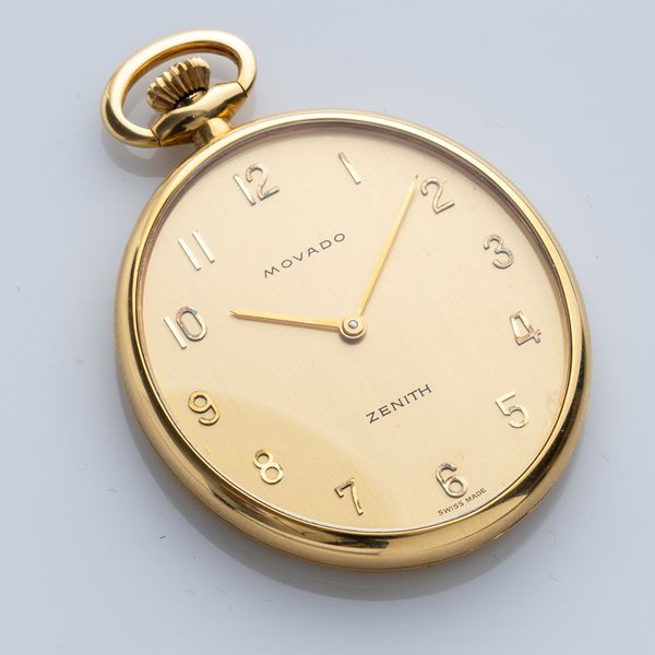 Note: Orologio da tasca con cassa monoblocco ovale in oro giallo 18kt. Quadrante champagne con indici arabi applicati e sfere a bastone in oro e doppia firma Movado Zenith. Vetro minerale bombato.