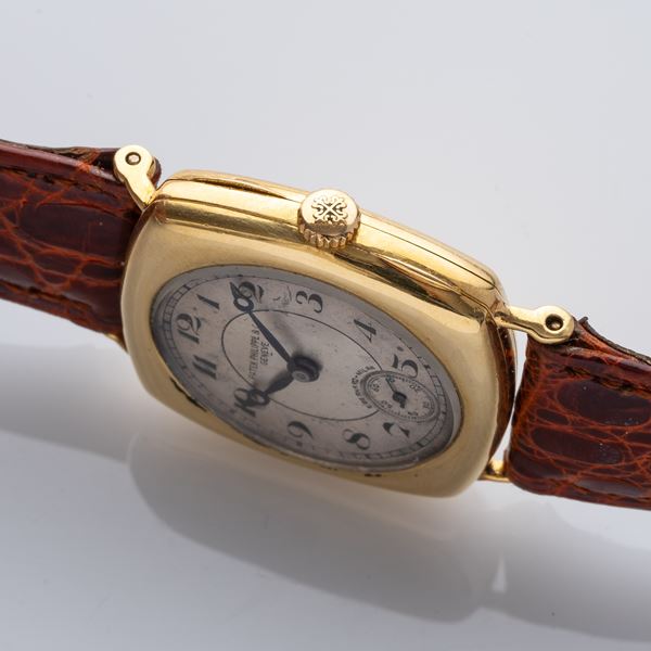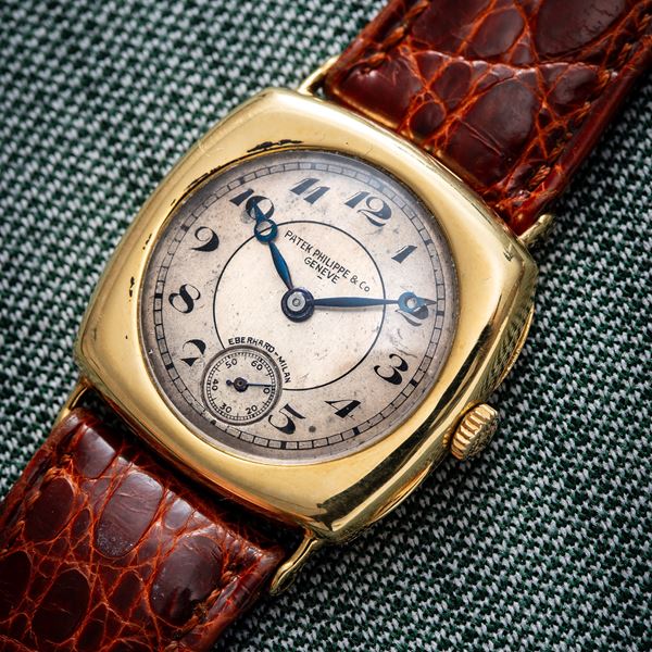Note: Cassa a cuscino in oro giallo 18kt con anse a filo e vetro minerale bombato. Orologio con quadrante recante il nome del retailer Eberhard Milan.