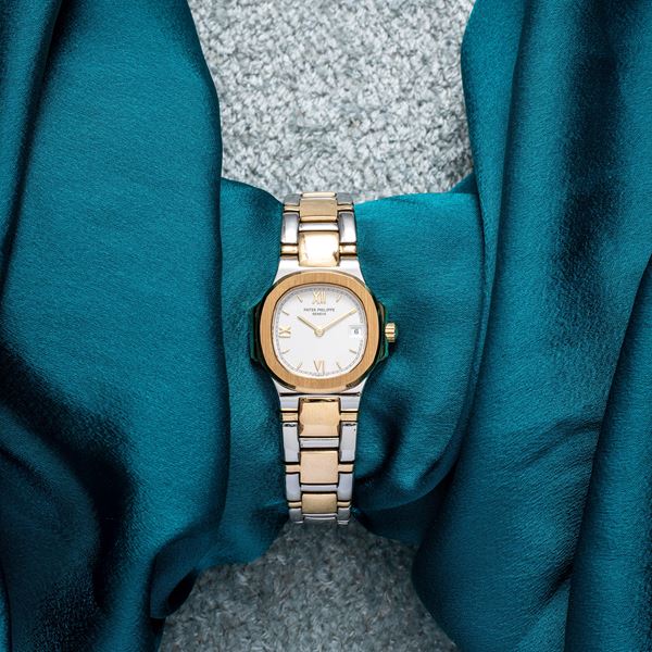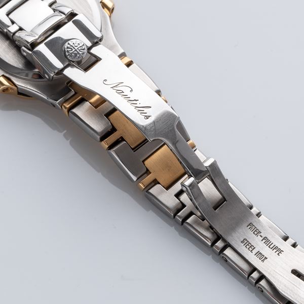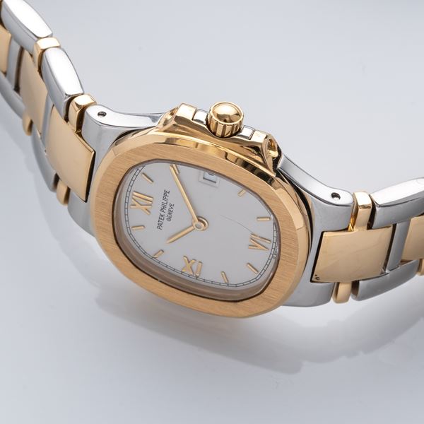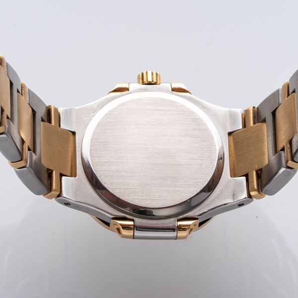 Note: Quadrante bianco con datario ad ore tre. Indici romani ad ore sei, nove e dodici e a bastone in oro 18kt. Sfere a bastone in oro 18kt. Ghiera in oro giallo 18kt, bracciale acciaio e oro 18kt. Vetro minerale piatto.