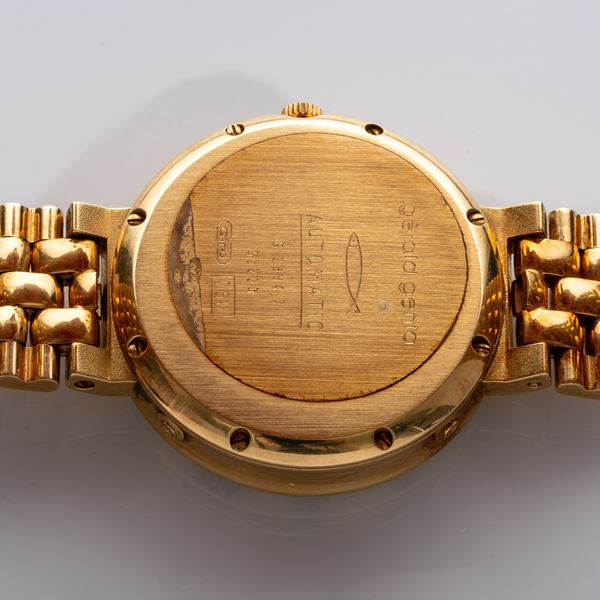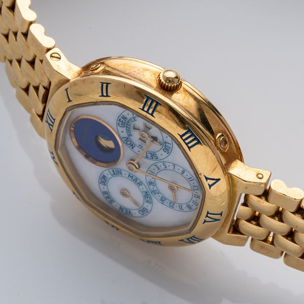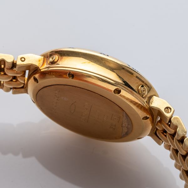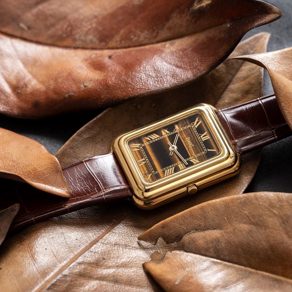 Note.cassa in oro giallo 18kt a scalino, quadrante in pietra occhio di tigre. Sfere a bastone, indici romani color oro. Fibbia Piaget in oro giallo 18kt. Vetro minerale piatto.