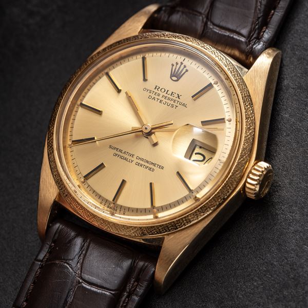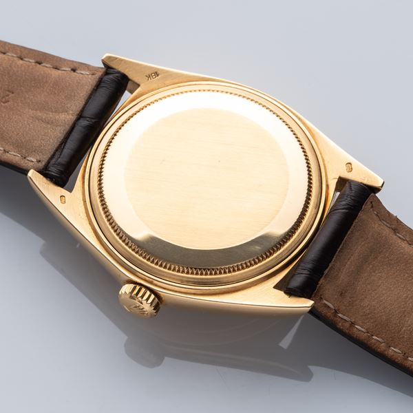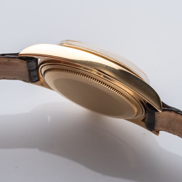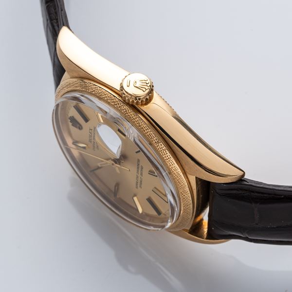 Note: Quadrante champagne 'pie pan' sigma, indici sfera a bastone in oro giallo 18kt, datario ad ore tre. Disco data tinta oro. Lavorazione ghiera 'Morelli'. Cassa in oro giallo 18kt, corona e fondello a vite. Vetro plexiglass bombato. Cinturino in pelle e fibbia Rolex.