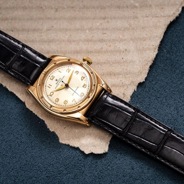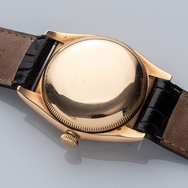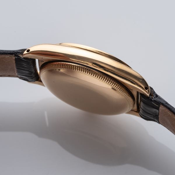 Note: Orologio in oro rosa 14kt. Quadrante bianco, numeri arabi applicati in color oro. Sfere a foglia in oro, sfera dei secondi brunita blu.