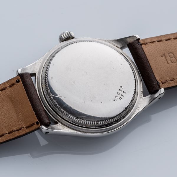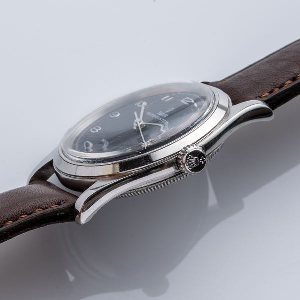 Note: Orologio in acciaio con carica a martelletto. Quadrante nero con indici arabi argentati e sfere a bastone. Vetro plexi bombato, corona e fondello a vite.