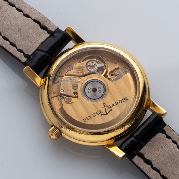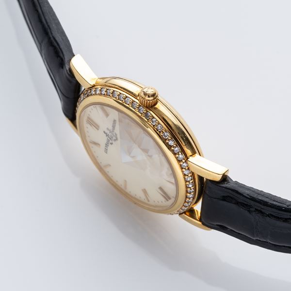 ULYSSE NARDIN - OROLOGIO DA DONNA A CARICA AUTOMATICA IN ORO GIALLO 18 KT CON GHIERA IN DIAMANTI E DATARIO A ORE TRE.
