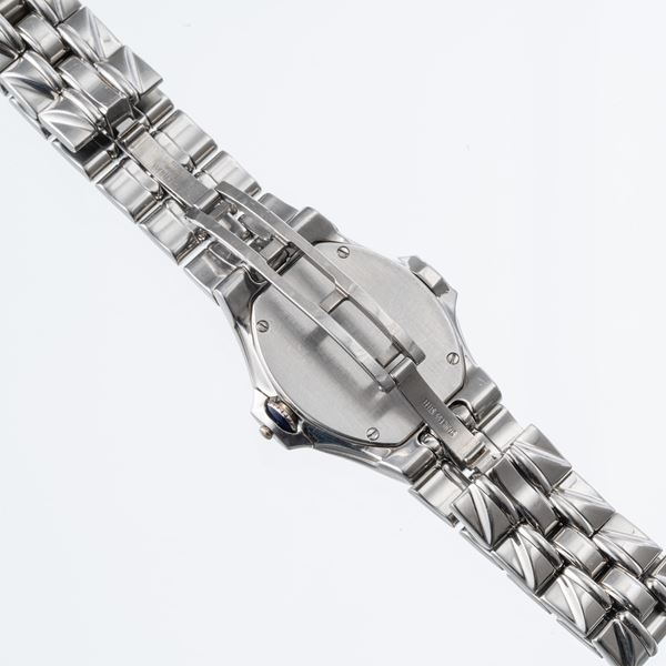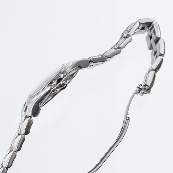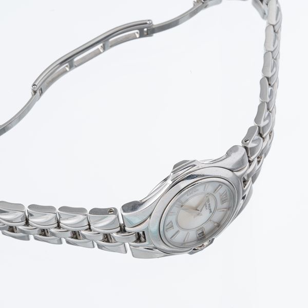 Note: Orologio in acciaio da donna al quarzo, datario ad ore tre. Quadrante madreperla con doppia lavorazione. Indici a bastone e indici romani ad ore dodici, sei e nove. Sfere in acciaio a gladio. Vetro minerale bombato.
