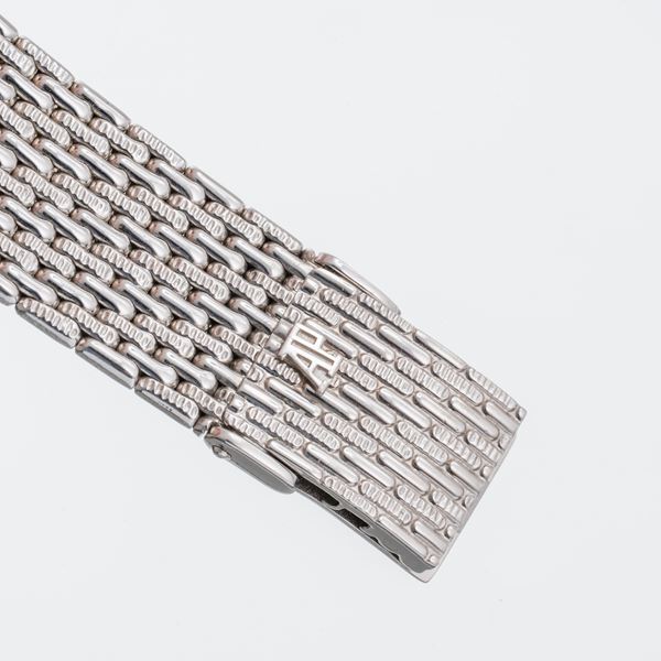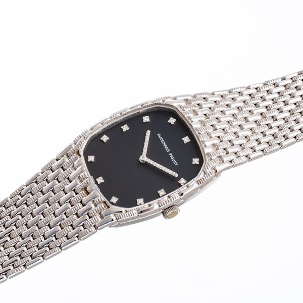OROLOGIO SOLO TEMPO A CARICA MANUALE IN ORO BIANCO 18KT CON BRACCIALE INTEGRATO IN ORO BIANCO 18KT,QUADRANTE NERO CON INDICI E SFERE CON DIAMANTI TAGLIO BRILLANTE