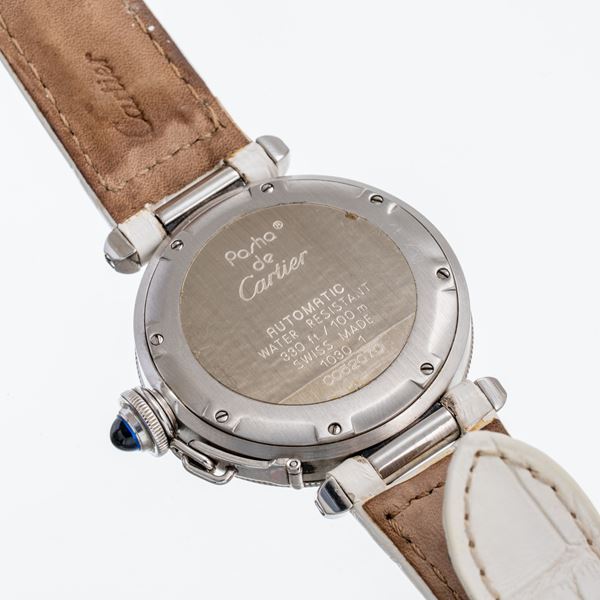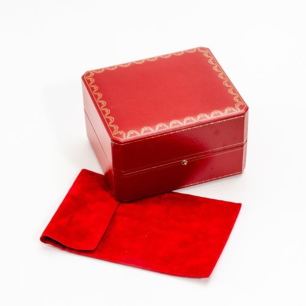 Note: Orologio a carica automatica in acciaio. Quadrante bianco, indici romani neri, sfere a gladio brunite blu con materiale luminescente. Datario ad ore cinque. Cinturino in pelle Cartier, deployante in acciaio Cartier. Corona con cabochon blu. Vetro minerale piatto.