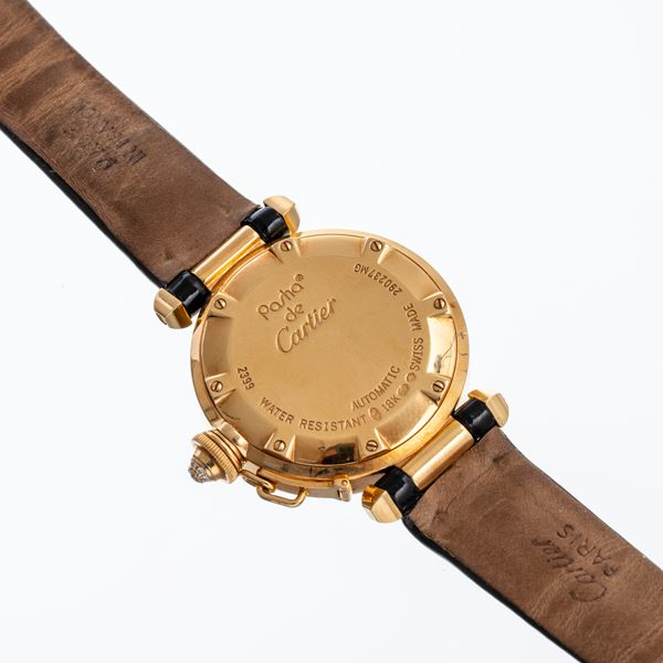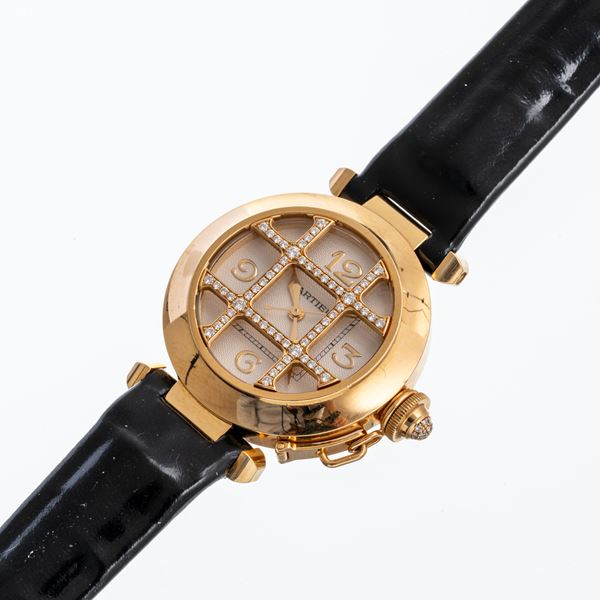 Note: Orologio in oro giallo 18kt, corona e copri vetro in oro giallo 18kt e diamanti. Quadrante bianco, indici in oro giallo arabi ad ore tre, sei, nove, dodici. Sfere a foglia in oro giallo. Vetro minerale piatto. Cinturino in pelle Cartier, fibbia Cartier in oro giallo 18kt.
