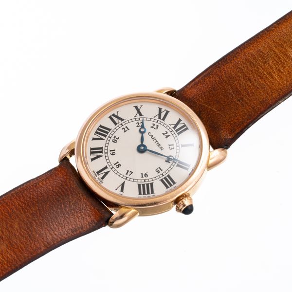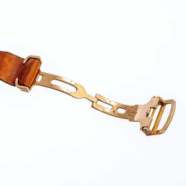 Note: Orologio solo tempo al quarzo in oro rosa 18kt. Quadrante bianco, indici romani e arabi neri, sfere breguet brunite blu. Cinturino in pelle Cariter, deployante in oro rosa 18kt Cartier. Vetro minerale bombato.