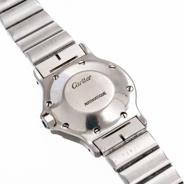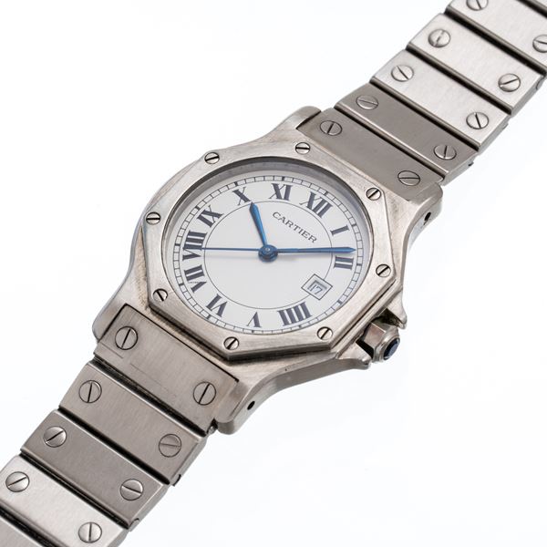 Note: Orologio a carica automatica in acciaio, datario ad ore tre. Quadrante bianco, indici romani, sfere a gladio brunite blu. Vetro minerale piatto. Chiusura a deployante Cartier.