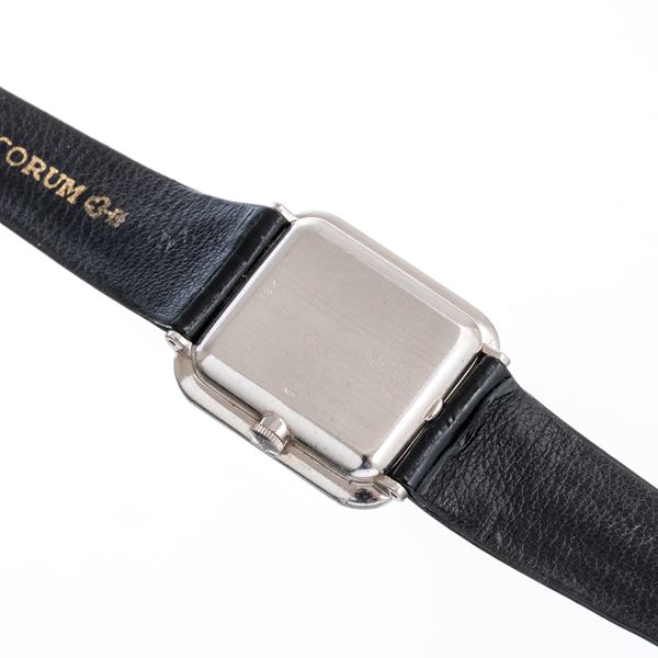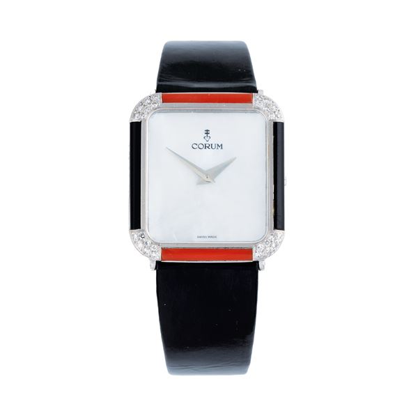 Note: Orologio solo tempo a carica manuale. Quadrante madreperla, sfere dauphine. Cassa in oro bianco 18kt, onice, corallo, diamanti taglio brillanti. Cinturino in pelle e fibbia Corum. Vetro minerale piatto, fondello a pressione in oro bianco 18kt.