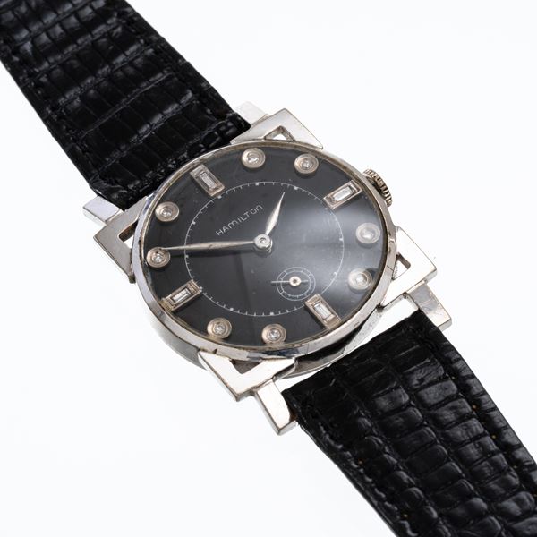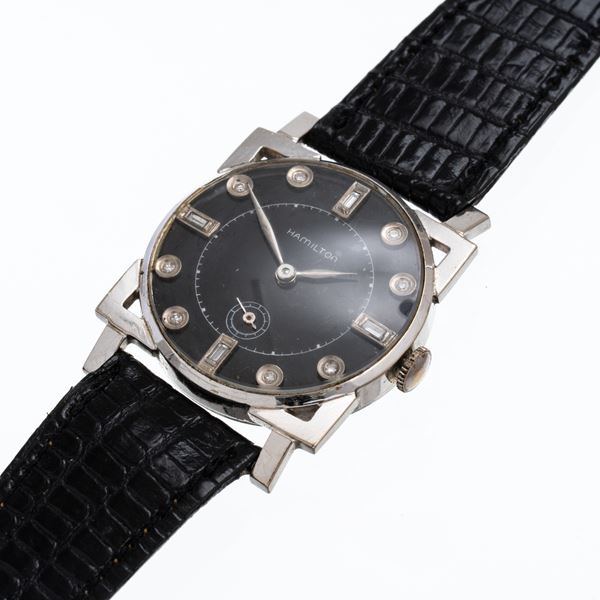 Note: Orologio solo tempo a carica manuale in oro bianco 14kt. Quadrante nero con indici in diamante taglio brillante. Sfere a foglia. Piccoli secondi ad ore sei. Corona di carica ad ore sei. Vetro minerale bombato. Fondello a pressione in oro bianco 14kt.