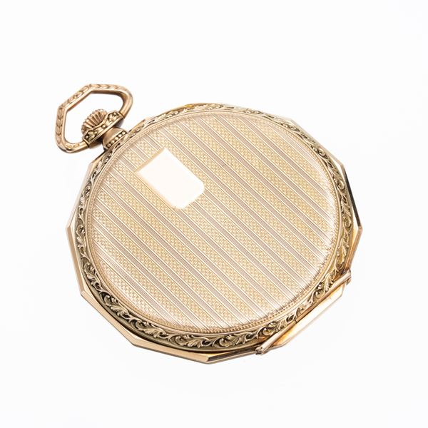Note: Orologio da tasca in oro giallo 14kt con quadrante bianco. Piccoli secondi ad ore sei. Sfere romane dorate, indici arabi dorati. Vetro minerale bombato. Fondello a pressione in oro giallo 14kt.