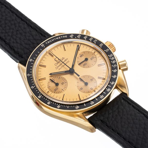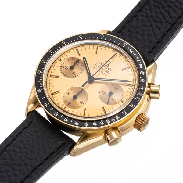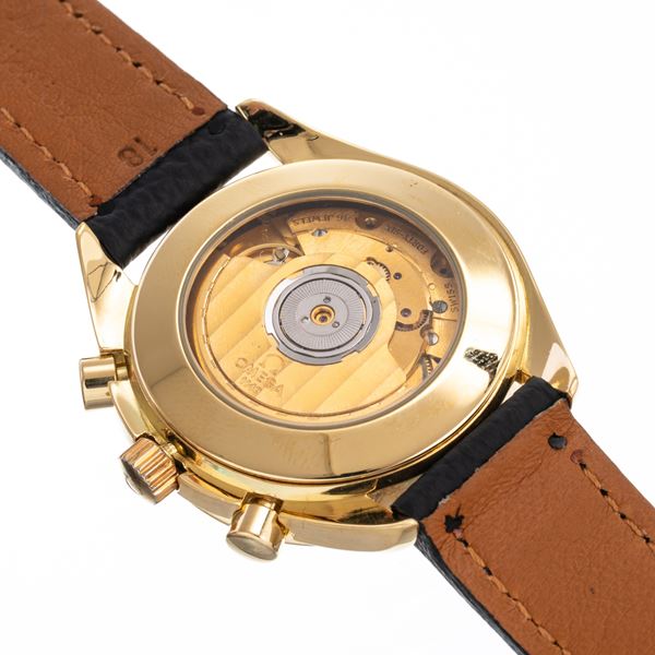 Note: Cronografo in oro giallo 18kt con quadrante champagne. Sfere a bastone nere con materiale luminescente, indici a bastone oro. Tre contatori cronografici con numeri arabi neri. Vetro plexi bombato, fondello a vista a pressione.