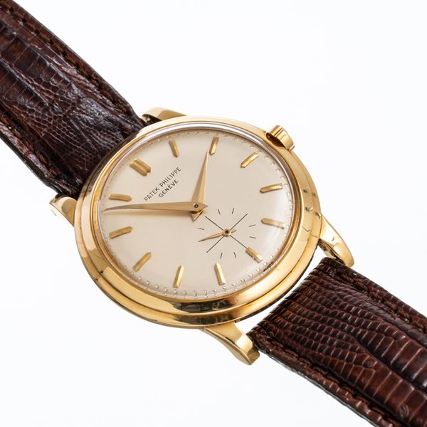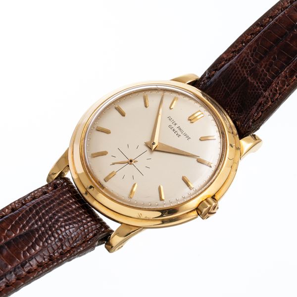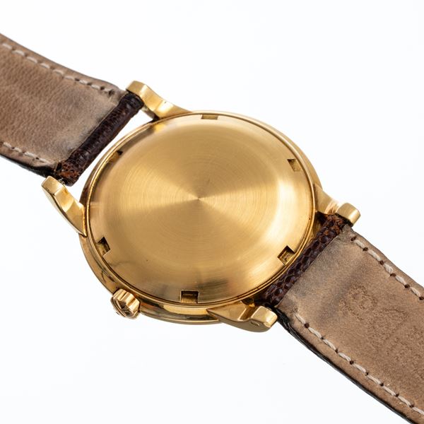 Note: Quadrante argentè con indici a bastone applicati e sfere dauphine in oro giallo. Piccoli secondi ad ore sei. Cassa a scalino. Vetro plexiglass bombato. Fondello a vite.