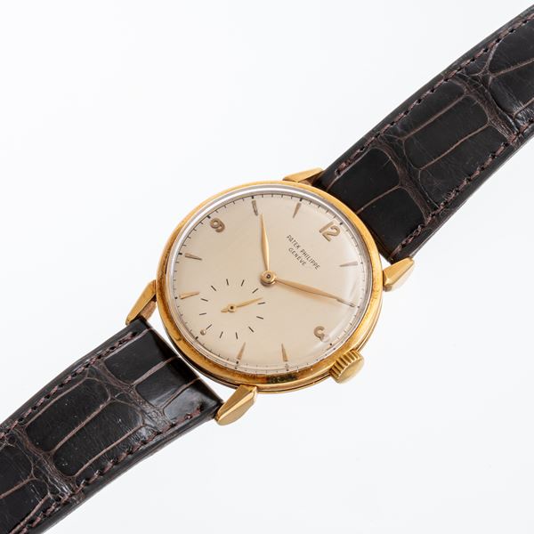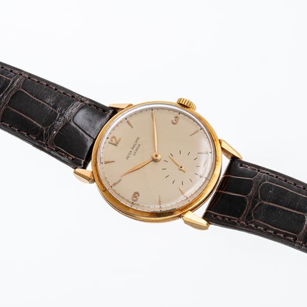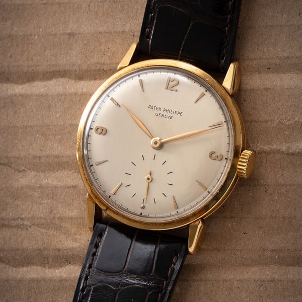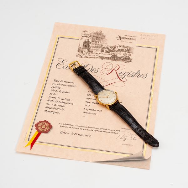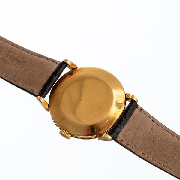 Note: Orologio solo tempo in oro giallo 18kt a carica manuale. Quadrante argenté, indici applicati e indici arabi ad ore tre sei e dodici in oro giallo 18kt. Piccoli secondi ad ore sei. Sfere a foglia in oro giallo 18kt. Vetro plexiglass bombato, fondello a pressione in oro giallo 18kt. Orologio con estratto d'archivio; prodotto e venduto nel 1953.