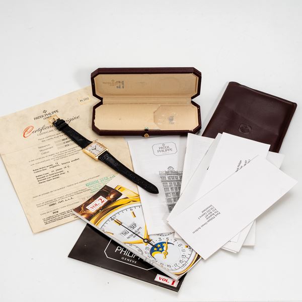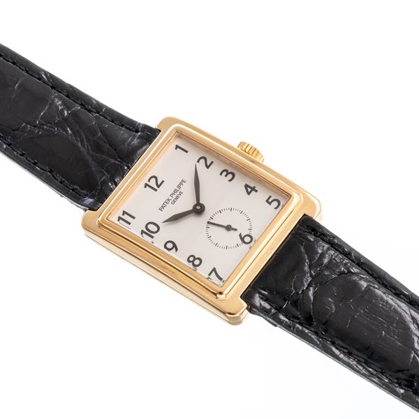 Note: Orologio solo tempo con cassa a scalino in oro giallo 18kt. Quadrante argenté con numeri arabi, piccoli secondi ad ore sei. Sfere a gladio. Vetro minerale curvo. Cinturino in pelle, fibbia in oro giallo 18kt Patek Philippe.