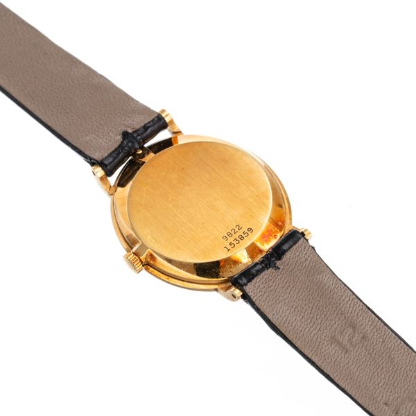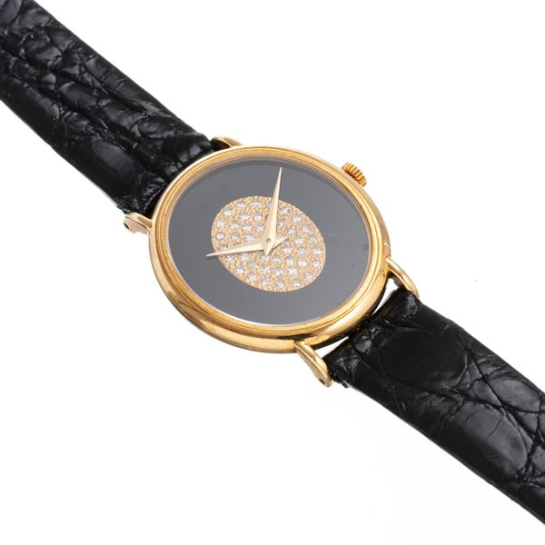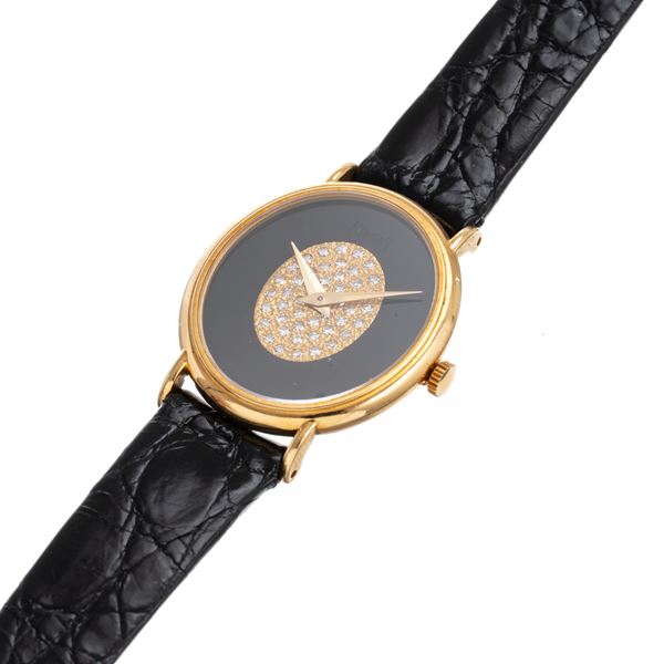 Note: Orologio a carica manuale in oro giallo 18kt. Quadrante in Onice e diamanti. Sfere dauphine in oro giallo 18kt. Cinturino Piaget, fibbia Piaget in oro giallo 18kt. Vetro minerale piatto.