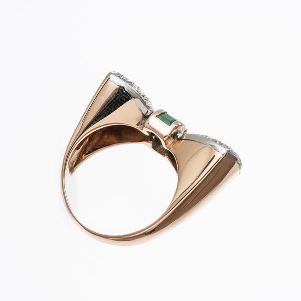 ANELLO A FIOCCO IN ORO ROSSO 12 KT CON SMERALDI E DIAMANTI TAGLIO BRILLANTE