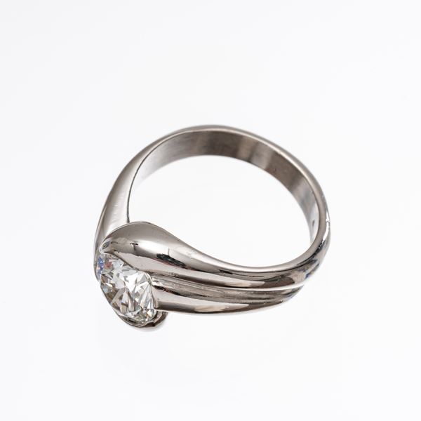Oro bianco 18 kt con diamante taglio brillante 2,04 ct colore F VS2 e contorno di diamanti taglio tondo e carrè per circa 0.50 ct.