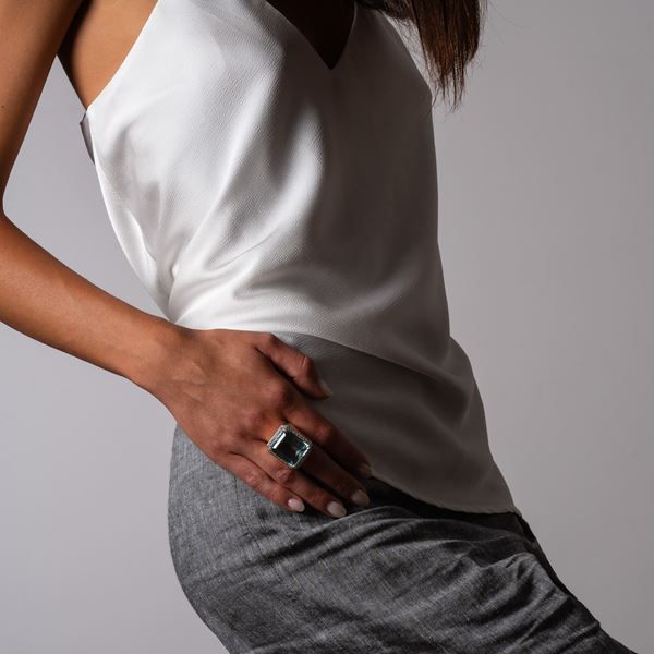 Oro giallo 18 kt con una grande acquamarina taglio rettangolare (22.30x19.30 mm) di circa 32 ct.