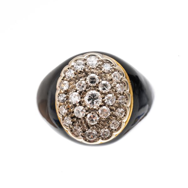 ANELLO IN ORO GIALLO 18 KT, DIAMANTI TAGLIO BRILLANTE E SMALTO NERO