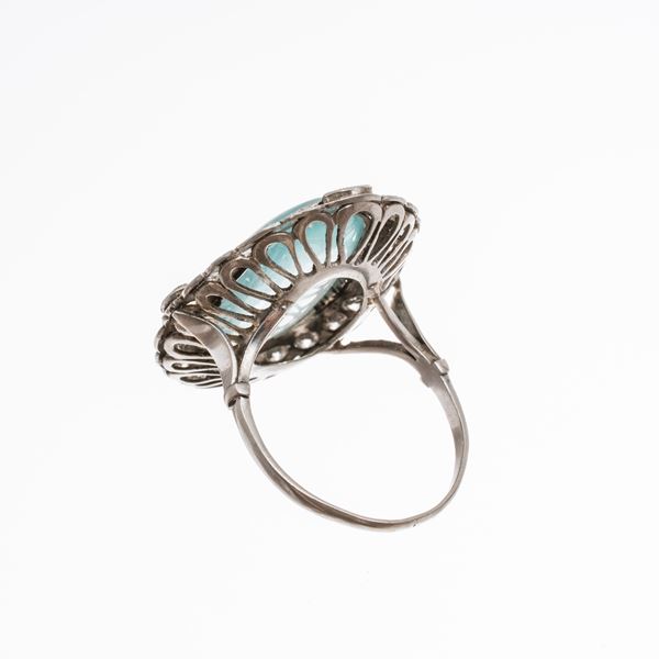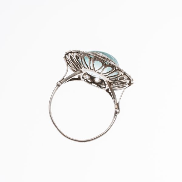 Platino con grande cabochon di acquamarina (19x13 h 2,65mm) per circa 4,80 ct, contorno di diamanti taglio antico per circa 1.00 ct.