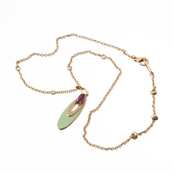 BULGARI - COLLANA MODELLO ELISIA IN ORO GIALLO 18 KT E TORMALINA CABOCHON ROSA, SMALTO VERDE E CONTORNO DI DIAMANTI TAGLIO BRILLANTE
