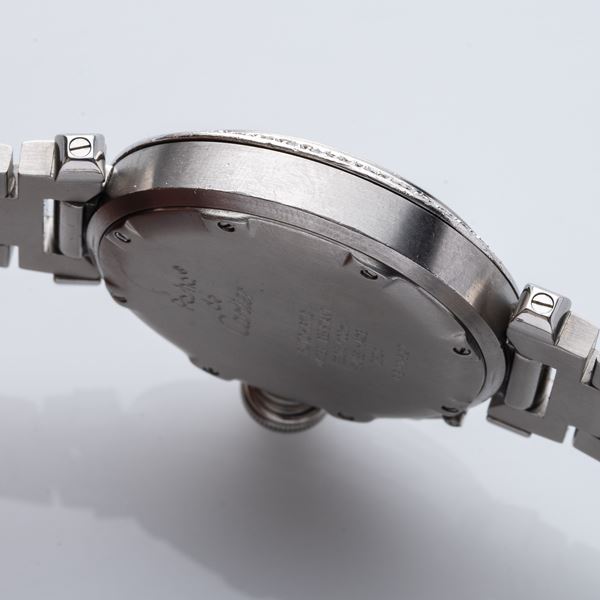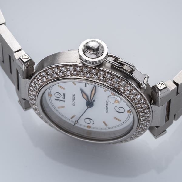 OROLOGIO A CARICA AUTOMATICA IN ACCIAIO CON GHIERA IN DIAMANTI E DATARIO AD ORE QUATTRO.