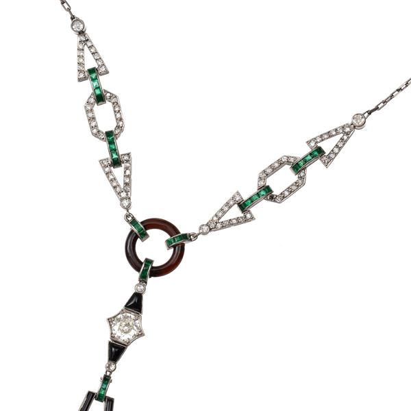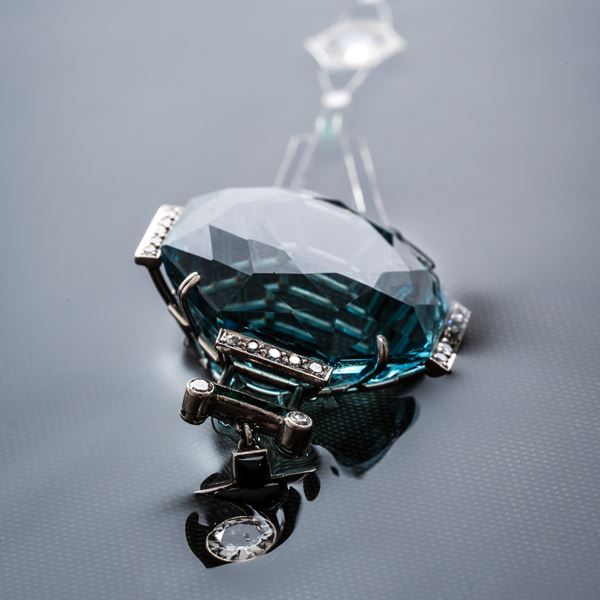 Collana in platino ad elementi geometrici con diamanti taglio brillante, smeraldi smalto nero con due diamanti taglio vecchio incolori da ct. 0.60 e 0.80 con una grande acquamarina ottagonale di 45,16 ct..