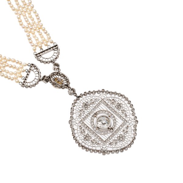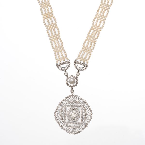 Collana in microperle lavorate a tessuto con parte centrale di mm 38 di diametro lavorato a pizzo con incastonato un diamante di vecchio taglio di circa ct. 2.50 bianco SI e contorno di diamanti huit huit per circa ct. 2.00.