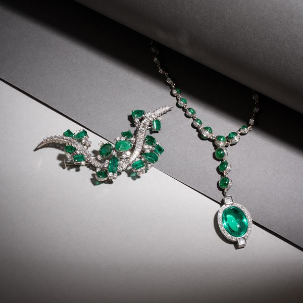 COLLANA IN SMERALDI CHABOCON E DIAMANTI E ORO BIANCO 18 KT