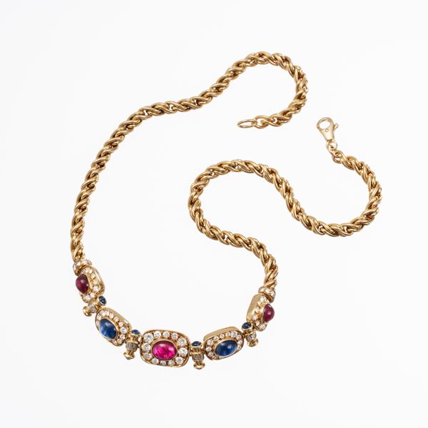 GIROCOLLO IN ORO GIALLO 18 KT CON ZAFFIRI, RUBINI E DIAMANTI TAGLIO BRILLANTE