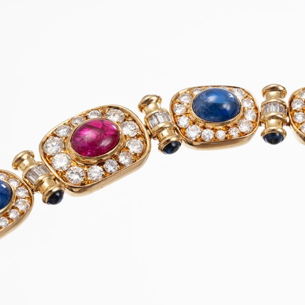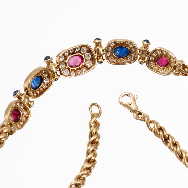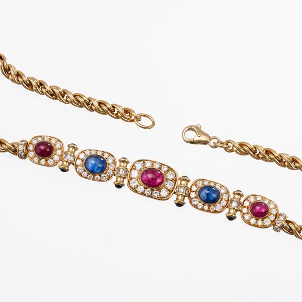 Oro giallo18 kt con zaffiri rubini cabochon per circa 4,50 ct. e diamanti taglio brillante incolori Vs per circa 2,20 ct.
