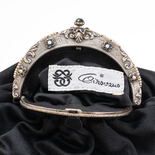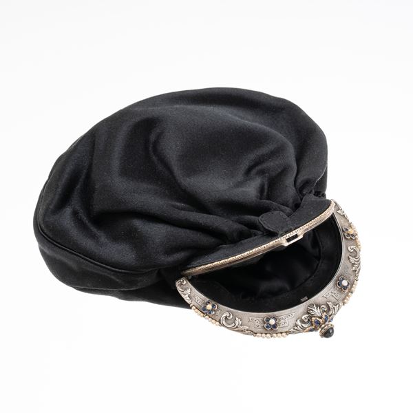 M. BUCCELLATI Borsetta da sera con chiusura in argento ed inserti in oro rosa finemente lavorata con zaffiri cabochon il più grande da 1 ct e perline; tessuto nero all' esterno e raso di seta nero per l'interno, complessivi g.92