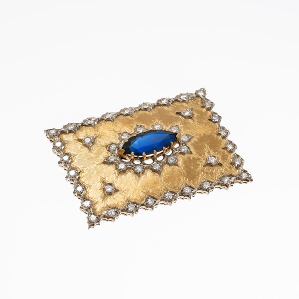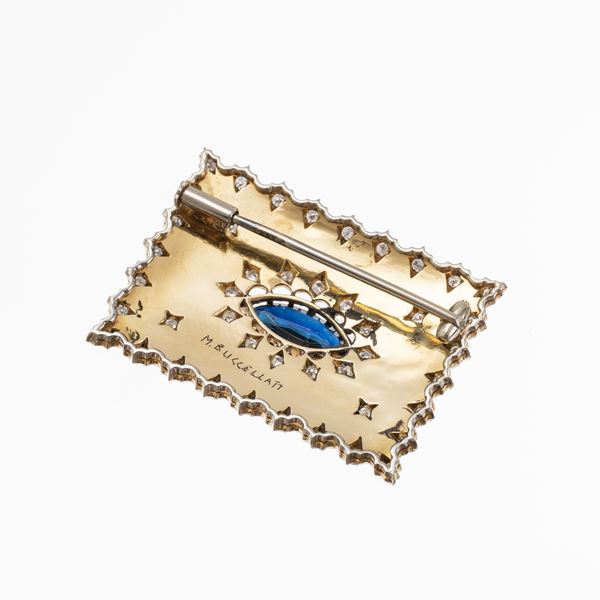 Mario Buccellati oro giallo inciso con 44 diamanti huit-huit per circa 0.40ct e zaffiro centrale a navette di circa 1 ct.