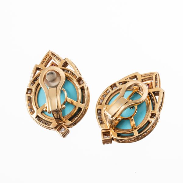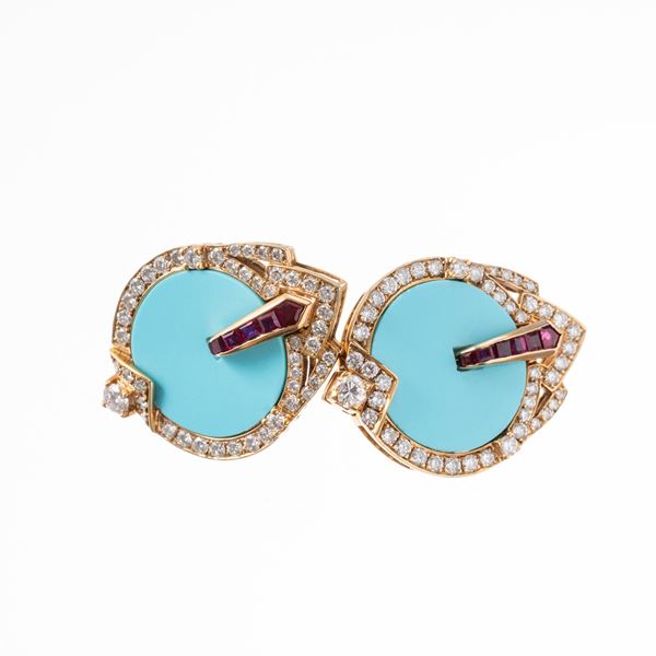 Oro giallo 18 kt con un disco di turchese stabilizzato contornato da diamanti taglio brillante per circa 2,00 ct e una riga di carrè di rubini per circa 1 ct.