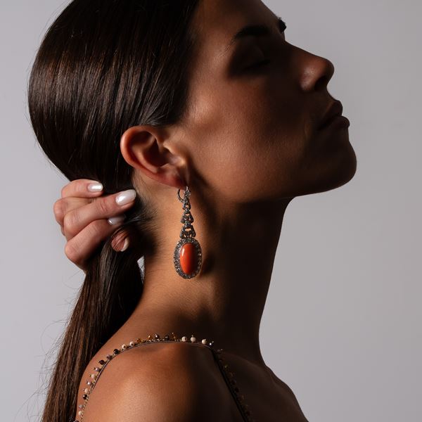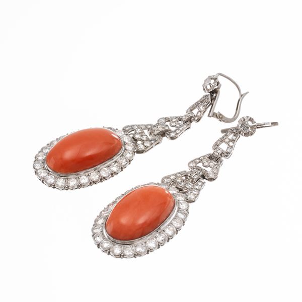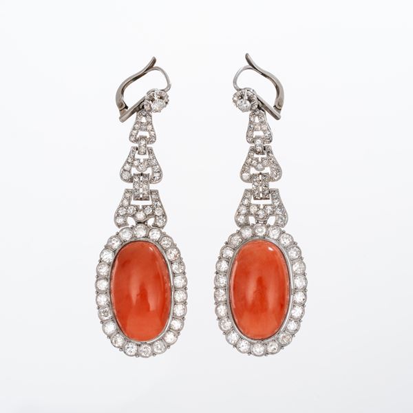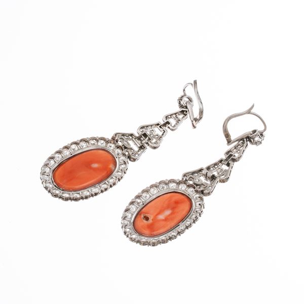 ORECCHINI IN PLATINO, CORALLO E DIAMANTI TAGLIO VECCHIO