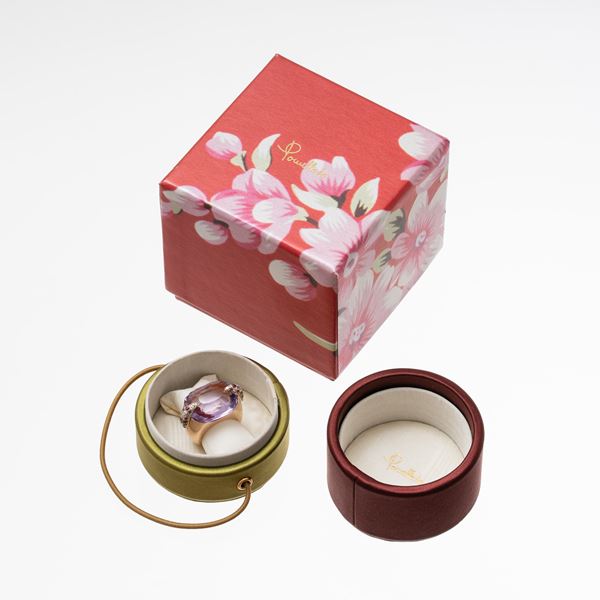 Anello in oro rosa 18 kt, modello Pin Up con ametista sfaccettata ed elementi laterali con pavè di diamanti taglio brillante e rubini.
