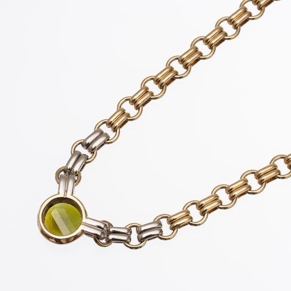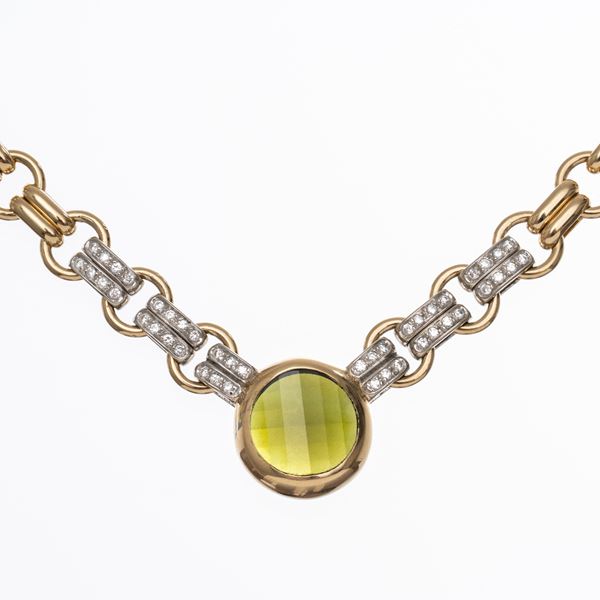 Girocollo in oro bianco e giallo 18 kt con diamanti taglio brillante per 0,33ct e tomanlina verde concava sfaccettata da 12 mm di diametro
