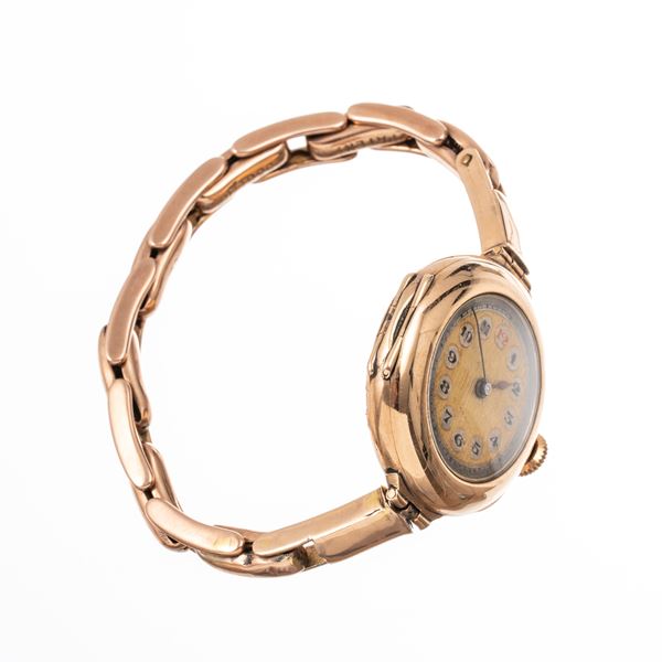 Note: Orologio solo tempo a carica manuale con cassa a cerniera Dennison in oro rosa 9ct. Quadrante giallo, sfere brunite nere, indici arabi. Bracciale elastico in oro rosa 9ct. Vetro minerale bombato.