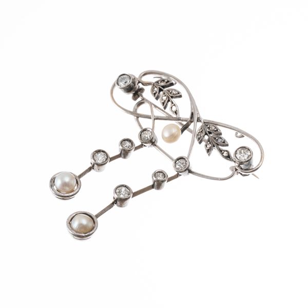 SPILLA IN ORO BIANCO 18 KT CON PERLE E DIAMANTI TAGLIO BRILLANTE