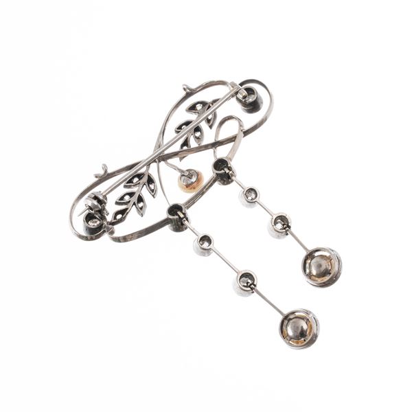 Oro bianco 18 kt con tre perle 5 mm e diamanti taglio antico per circa 0,70 ct.