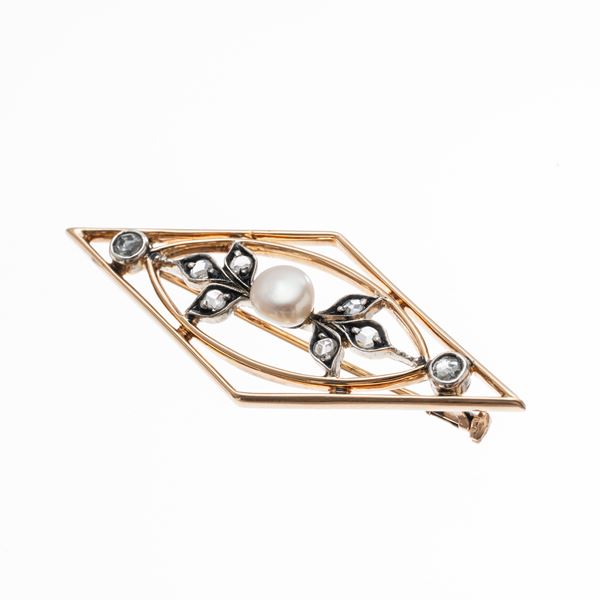 Oro giallo 18 kt con perla centrale a cipollina di 6 mm e rosette di diamante montate su argento per circa 0,10 ct.